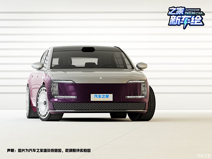 来看车头,有几处造型与之前假想图不同,咱们从上到下说。首先是车标位置,实车并没有采用立标,而是镶嵌在其中的发光平面Logo,在其周围是类似电镀反光材质的覆盖件,与发动机盖和下部的紫色车身在颜色和材质上形成反差感。