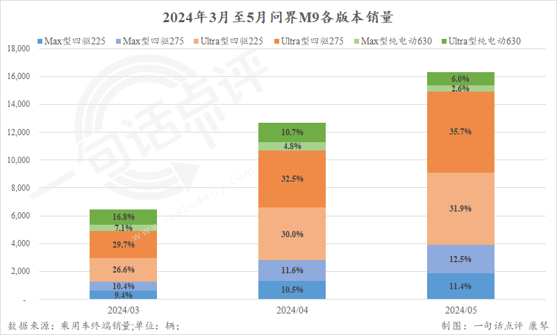 需要说明的是,由于2月底交付的1,324辆未区分版本,因此对只3月至5月售出的35,410辆问界M9的版本情况进行分析。