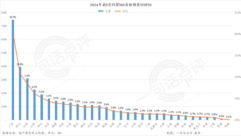 在所有省份中,广东的销量遥遥领先于其他省份,达到7,462辆,与之对应的是占比高达20.3%。换言之,仅广东就贡献问界M9全国五分之一的销量,甚至略高于浙江与江苏的销量之和。不过,浙江也不能小觑,其占比也达到10.8%。