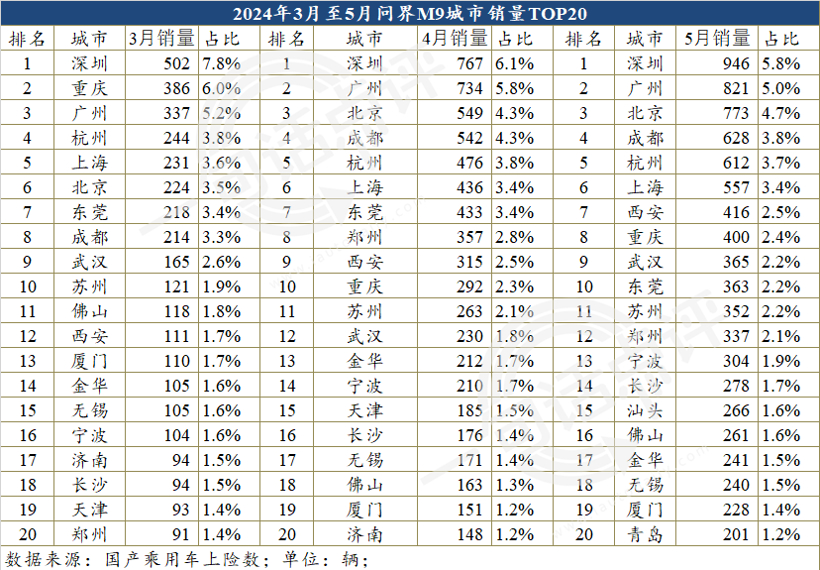 统计中发现,每个月广东的深圳、广州、东莞和佛山都出现在榜单中,并且前三者均跻身十强之列,其中深圳还连续三个月蝉联冠军宝座。此外,5月汕头还上榜了。因此,广东会成为问界M9销量最多的省份也在情理之中。