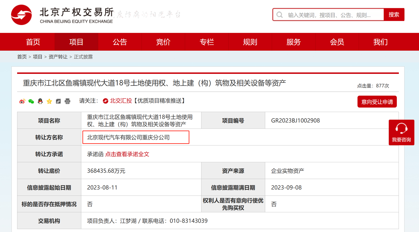 近日,据北京产权交易所网站发布的文件显示,北京现代拟以36.84亿元的价格转让位于重庆的工厂。出售的资产包括土地使用权、地上建(构)筑物及相关设备等资产。与当年77亿元的总投资相比,相当于打五折出售。