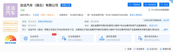 日前,法法汽车(湖北)有限公司在黄冈成立,注册资本为1亿美元,法定代表人为王志刚。信息显示,该公司经营范围包含道路机动车辆生产、新能源汽车整车销售、汽车零部件研发、智能车载设备制造等。股东信息方面,该公司由FF Hong Kong Holding Limited全资持股。