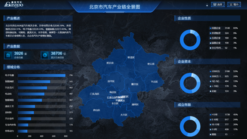 北京地区汽车产业经过多年发展,已经拥有完整的整车制造、零部件生产、研发设计、销售服务等方面。根据优车视野供应链平台数据统计,北京地区汽车产业链关联企业约3926家,其中占比最高的为电子电器类企业,共796家,占比20.3%,代表企业有京东方、松下电器、金像电子等;其次是智能网联类企业共543家,占比13.8%,代表企业有百度、经纬恒润、镁佳等;汽车芯片类企业共492家,占比12.5%,代表企业有北京地平线、北京君正、英特尔、英伟达等;电气化、智能制造和通用工艺类企业数量分别位列四五六位。