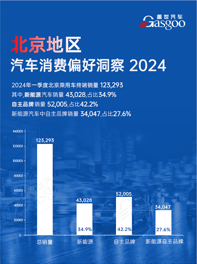 根据优车视野研究院终端数据整理,北京地区2024年1-3月乘用车终端销量为12.3万辆。其中,新能源汽车销量为4.3万辆,占比为34.9%,自主品牌新能源销量为3.4万辆,贡献了新能源销量的65.5%,占整体市场份额的27.6%。