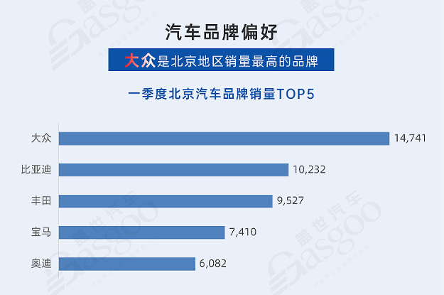 大众品牌最受欢迎。北京地区品牌销量TOP5分别是大众、比亚迪、丰田、宝马和奥迪。大众品牌以14741辆的成绩登顶北京地区第一季度销量榜首。比亚迪得益于第一季度各主力车型的荣耀版密集上市,其极高的性价比获得消费者青睐,以10232辆排名第二。丰田、宝马、奥迪分别以9527辆,7410辆和6082辆获得第三、四、五名。
