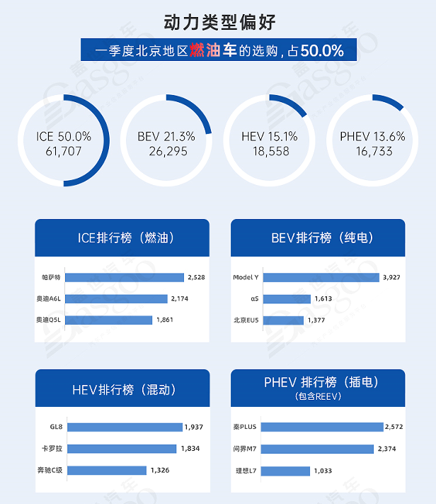 燃油车选购比例50%。1-3月北京地区燃油车销量6.2万辆,销量占比50%。新能源销量4.3万辆,销量占比34.9%,其中纯电销量2.6万辆,在新能源市场中占比61%,插混销量1.7万辆,在新能源市场中占比39%。混合动力销量1.9万辆,销量占比15.1%。