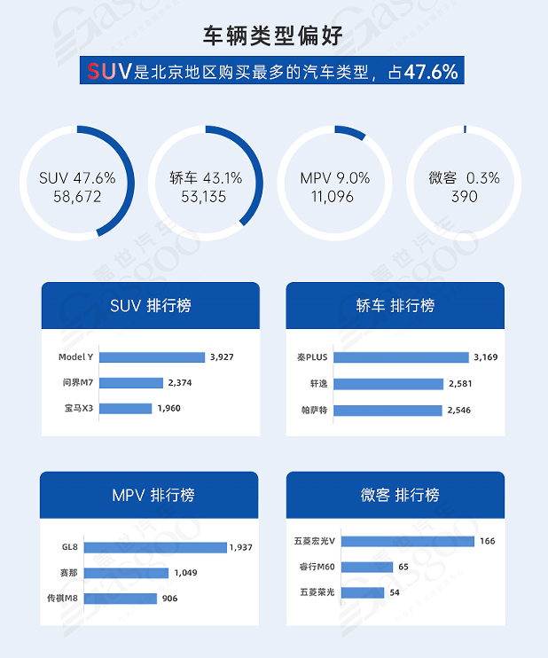 SUV是北京地区购买最多的汽车类型。1-3月北京地区SUV销量5.9万辆,销量占比47.6%,其中Model Y、问界M7、宝马X3是最受消费者喜爱的三款SUV。轿车销量5.3万辆,销量占比43.1%,其中秦PLUS、轩逸、帕萨特是最受消费者喜欢的三款轿车。MPV销量1.1万辆,其中GL8、赛那、传祺M8是受消费者喜欢的三款MPV。