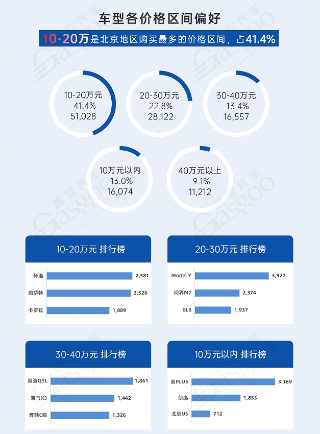 10-20万元占比41.4%。1-3月北京地区购买最多的价格区间为10-20万元,销量为5.1万辆,占比为41.4%。其次为20-30万元和30-40万元,分别销售了2.8万辆和1.7万辆,占比22.8%和13.4%。